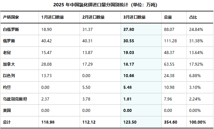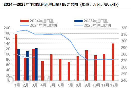 根据海关的最新数据,2025年3月,中国氯化钾的进口量为123.50万吨,环比增长10.15%。2025年1—3月,累计进口量为354.60万吨,同比减少7.58%。
